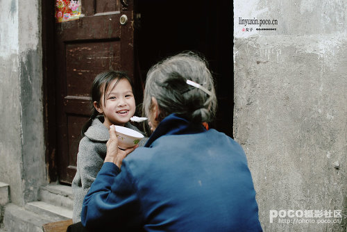 i guess....the grandma is feeding her grandchild......chinese people are used to feeding their children even when they are old enough to feed themselves